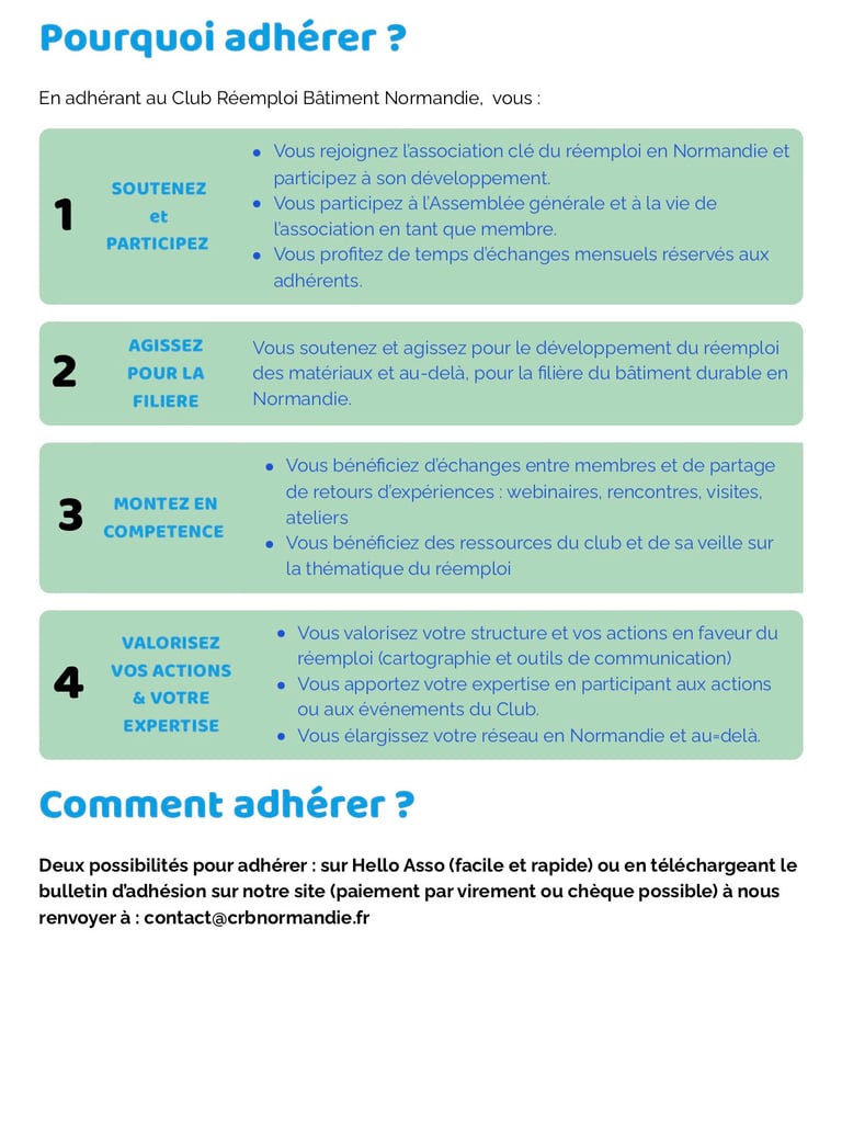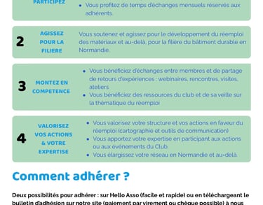 Le réemploi ne se fera pas seul ! Vous êtes ou souhaitez être actif dans la filière du réemploi en Normandie, vous avez participé à des évènements du club par le passé, c'est le moment de s'engager concrètement pour renforcer nos liens sur le territoire et développer la filière sur notre territoire. En adhérant, nous vous invitons à participer, soutenir et bénéficier de cette dynamique avec de nombreux acteurs normands de l’ensemble de la chaîne du bâtiment.